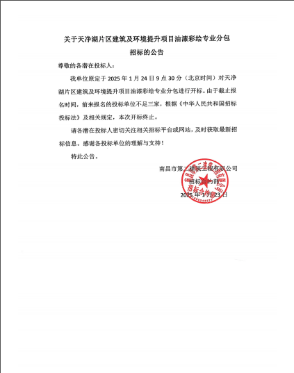 關(guān)于天凈湖片區(qū)建筑及環(huán)境提升項目油漆彩繪專業(yè)分包招標的公告